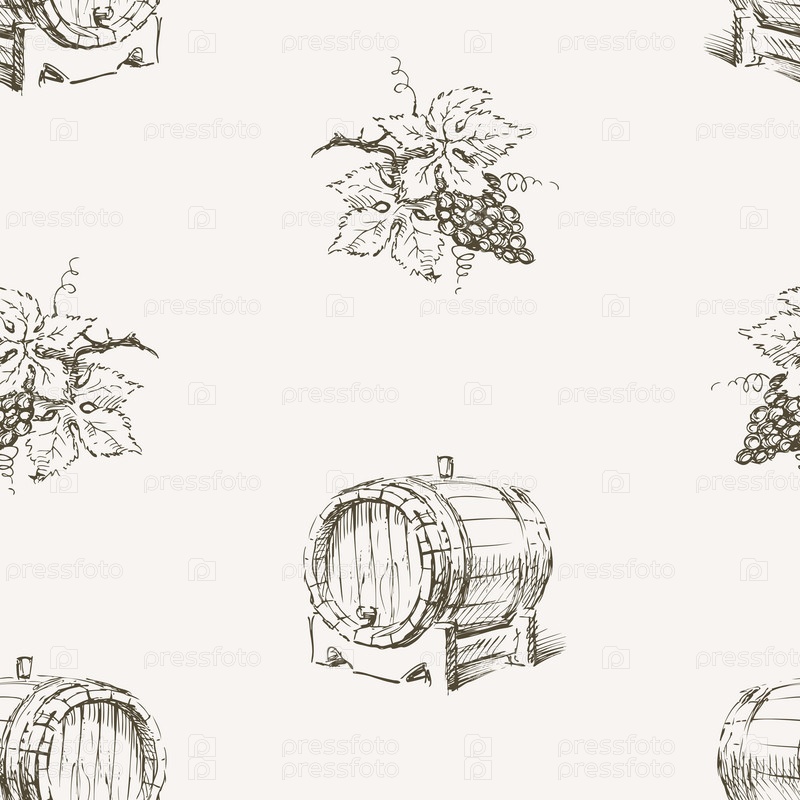 Бесшовный рисунок эскизов винной бочки и грозди виноградной лозы