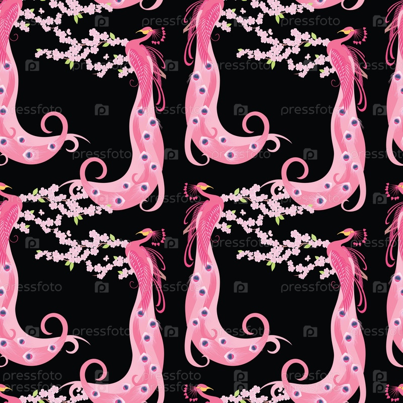 Бесшовный рисунок павлинов на цветущей ветке дерева