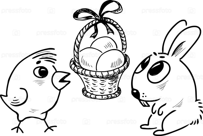 Пасхальная корзинка с яйцами, пасхальным кроликом и цыпленком