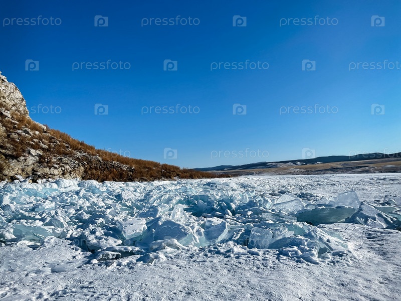 Солнечный зимний день на озере Байкал. Пейзаж горы на закате с естественным ломающимся льдом в замерзшей воде на озере Байкал, Сибирь, Россия