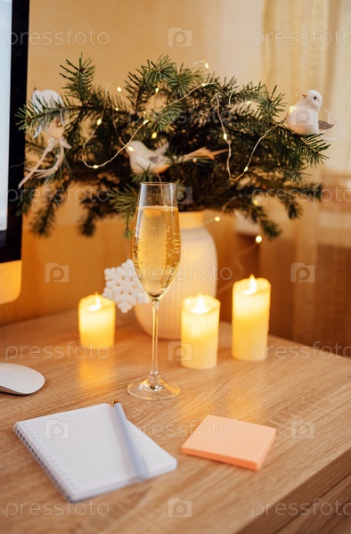 Рождественские украшения на уютном рабочем месте с шампанским