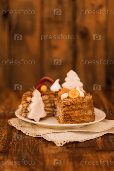 Милый рождественский торт, украшенный пряничным человечком, печеньем в форме елки