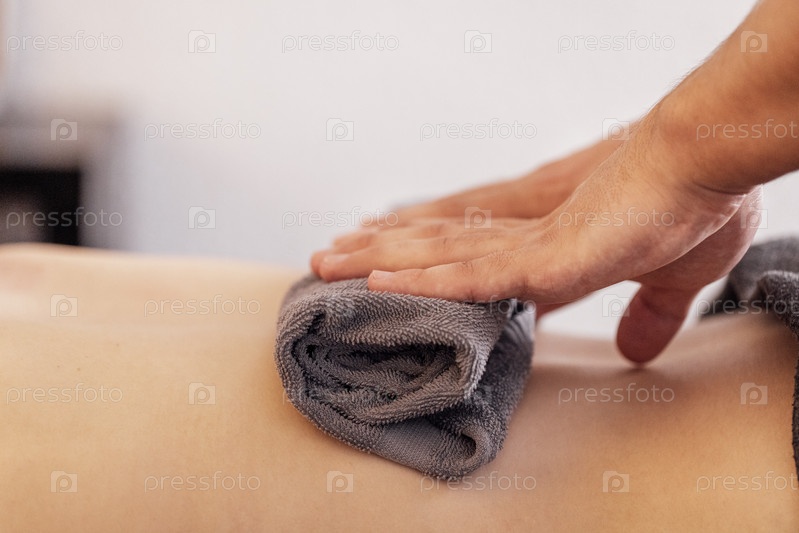 Крупный план аккуратных мужских рук-массажистов, лежащих на полотенце