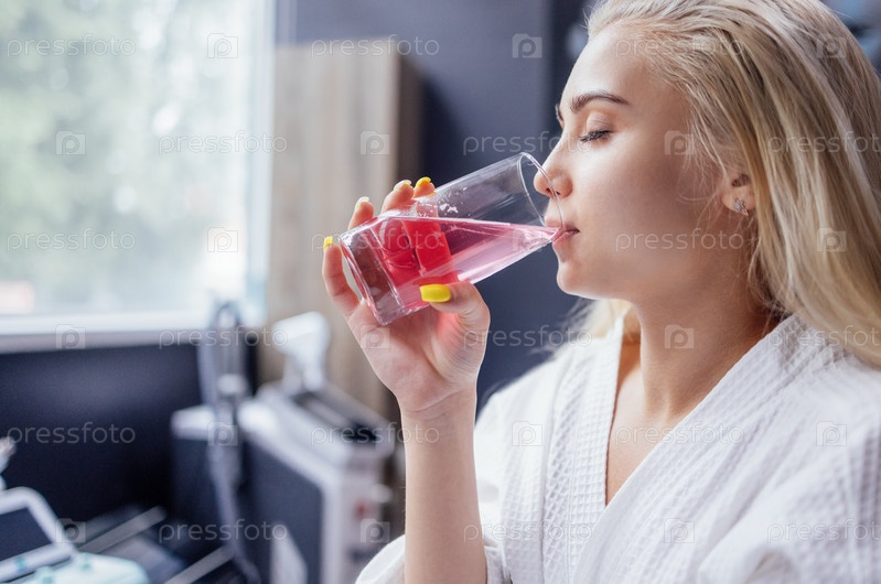 Молодая блондинка в белом халате с закрытыми глазами пьет витаминный коктейль в салоне красоты или клинике. Современный интерьер