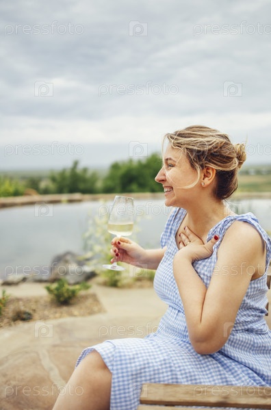 Молодая привлекательная женщина в легком сарафане держит бокал шампанского и смеется