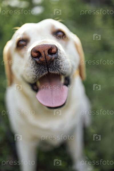 Крупный план вырезанного золотистого лабрадора в природе. Красивая домашняя собака