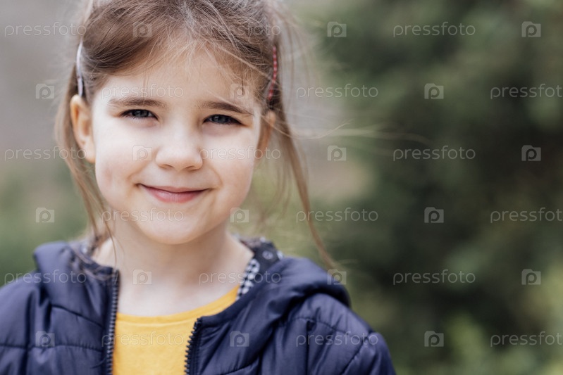 Крупный план детского портрета милой маленькой девочки в желтой рубашке и синей куртке