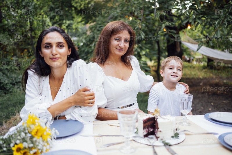 Маленький мальчик, его мама и бабушка сидят за праздничным столом. Счастливая семья празднует день рождения