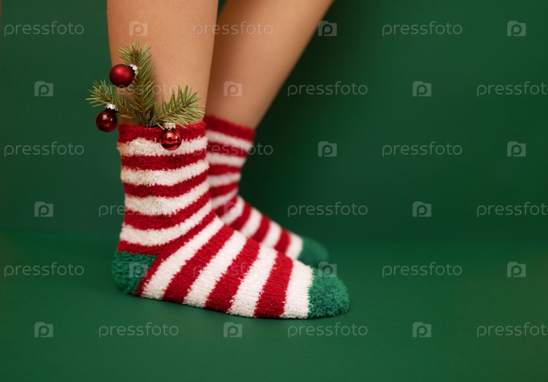 Гилс ножки в пушистых новогодних теплых носочках. Елочная ветка с шарами украшает женскую ножку. Студийный снимок