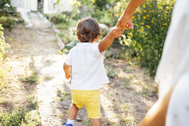 Маленький мальчик идет рука об руку со своей матерью по тропинке в саду