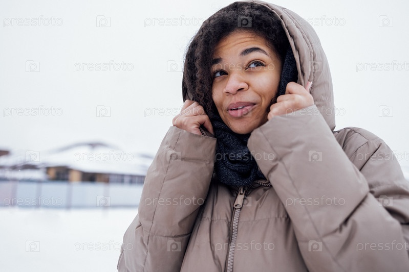 Крупным планом красивая девушка смешанной расы чувствует холод и кутается в вязаный шерстяной шарф