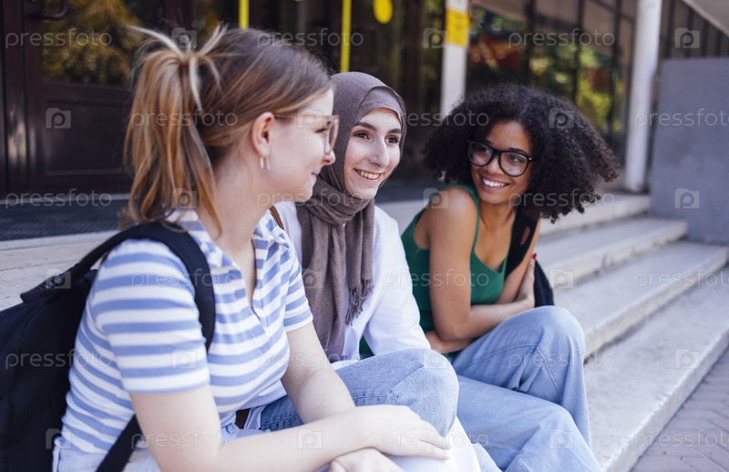 Студентки разных рас смеются и болтают на ступеньках колледжа или университета