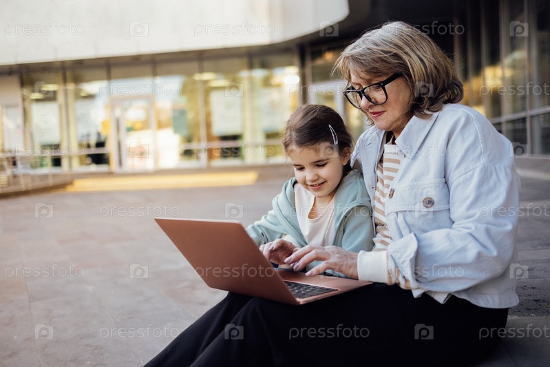 Женщина средних лет и маленькая девочка сидят на улице с ноутбуком