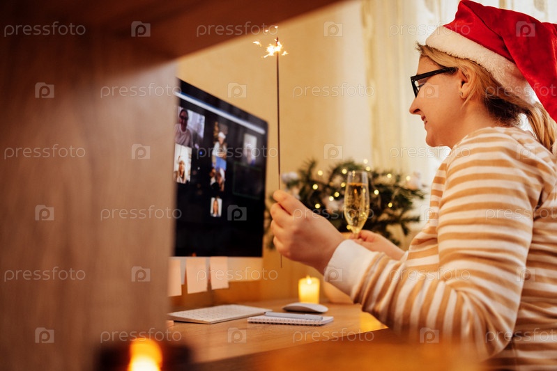 Молодая женщина в шляпе Санты счастливо общается по видеосвязи с друзьями