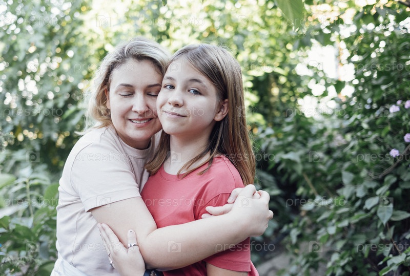 Молодая женщина закрыла глаза и обнимает свою милую дочь-подростка на улице