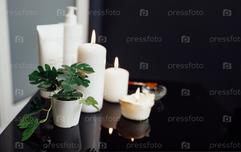 Зажженные свечи, макеты косметики и стеклянная тарелка с прозрачным гелем с кистью