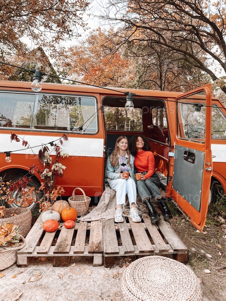 Пикник на осенней природе. Две счастливые многорасовые подруги сидят на багажнике машины в лесу
