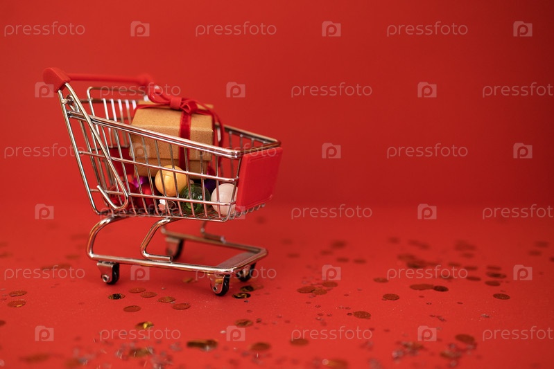Миниатюрная корзина с подарком из крафт-бумаги на красном фоне