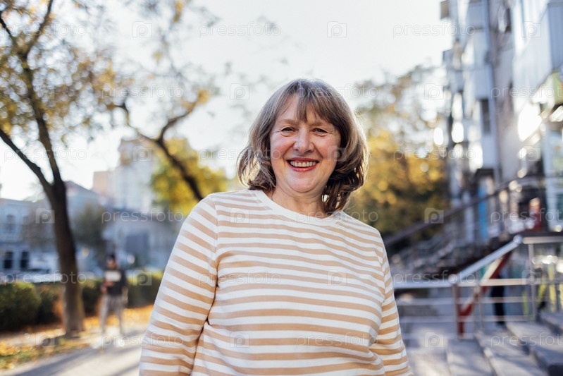 Крупный план портрета симпатичной женщины средних лет, позирующей на улице