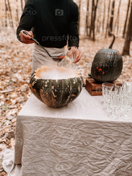 Кавказский мужчина в фартуке наливает горячий коктейль из тыквы в осеннем парке. Бариста Юонг наливает дымящийся тыквенный сок в прозрачные стаканы. Кулинарные изыски. Крупным планом