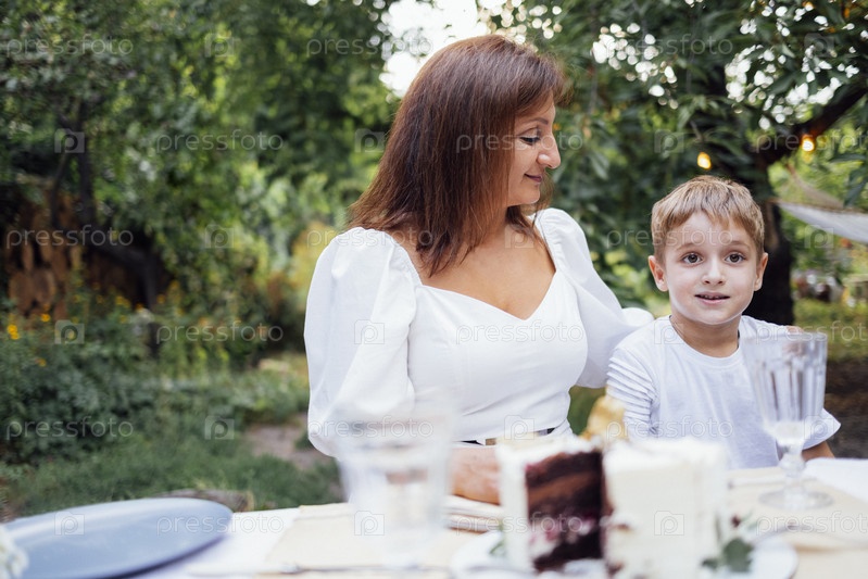 Женщина средних лет в элегантном белом платье и милый мальчик за праздничным столом на открытом воздухе