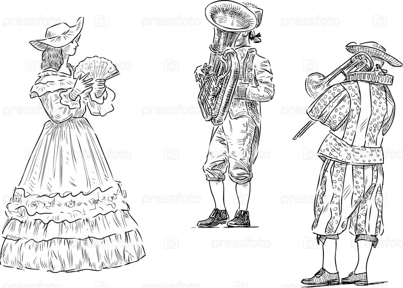 Эскиз женщины в винтажном костюме и музыкантов в карнавальных костюмах, играющих на трубах