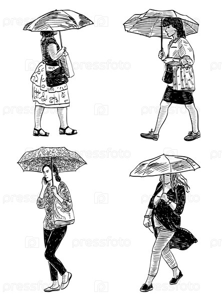 Зарисовки городских женщин, идущих по улице под зонтиками в дождливую погоду