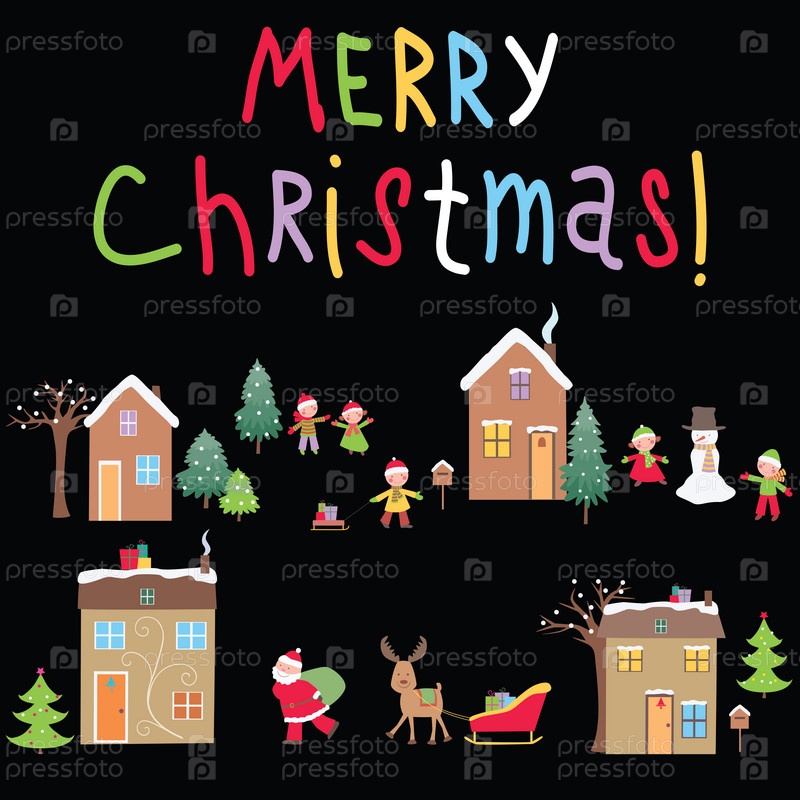 Векторная рождественская открытка с Санта-Клаусом и счастливыми детьми