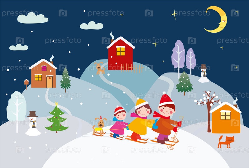 Счастливая семья катается на лыжах в канун Рождества