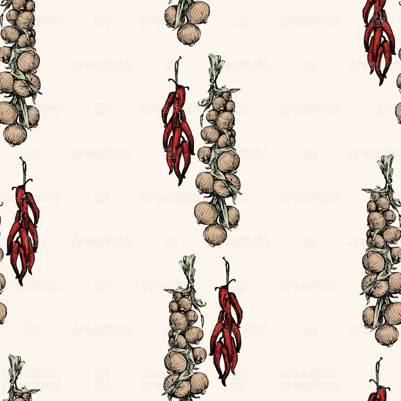 Бесшовный фон эскизов связок спелого красного перца и лука