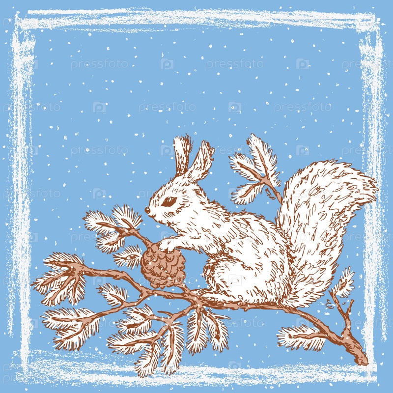 Векторная карта с текстурированной замороженной рамкой и нарисованной белкой с еловой шишкой, сидящей на еловой ветке