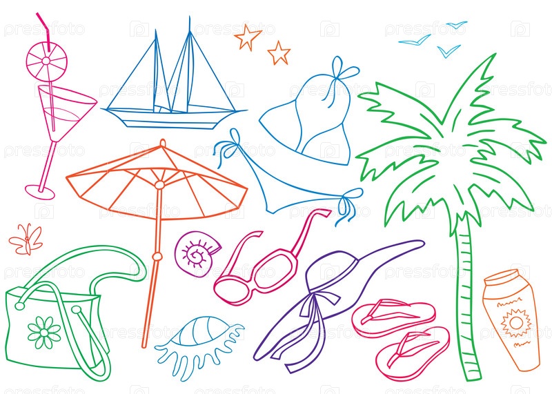 Векторные контурные рисунки различных символов пляжного отдыха