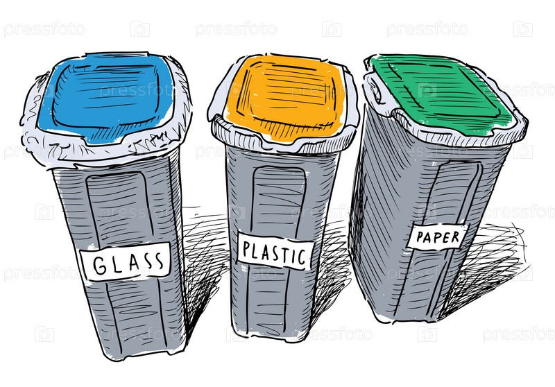 Векторный рисунок мусорных баков с сортировкой по бумаге, пластику и стеклу