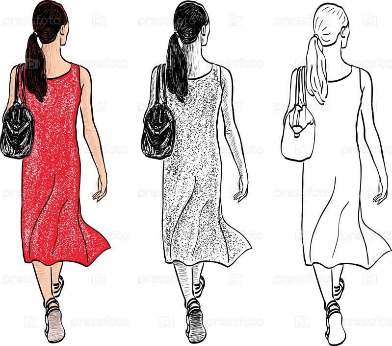 Векторный рисунок молодой городской женщины, идущей по улице в летний день
