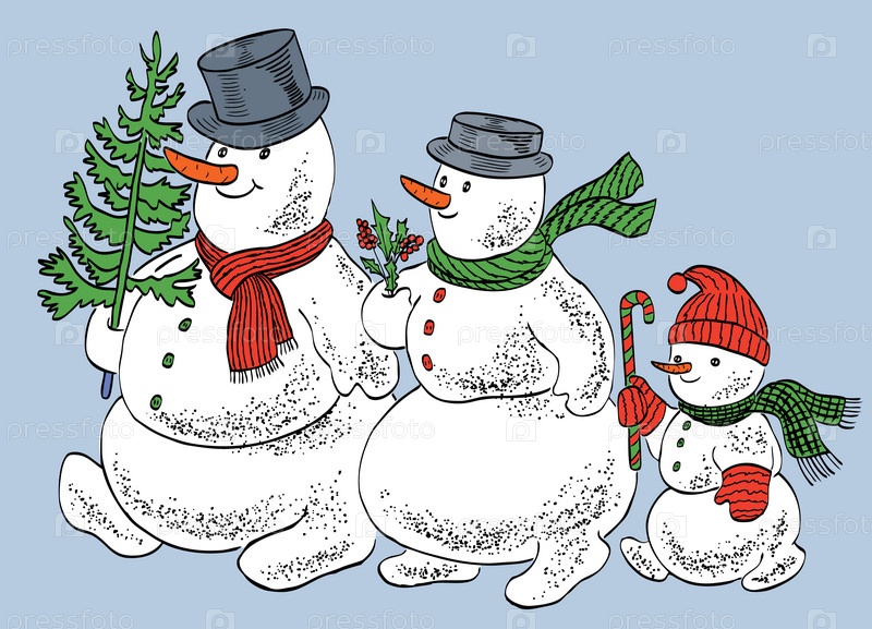 Векторная иллюстрация семейных счастливых снеговиков, гуляющих вместе на Рождество