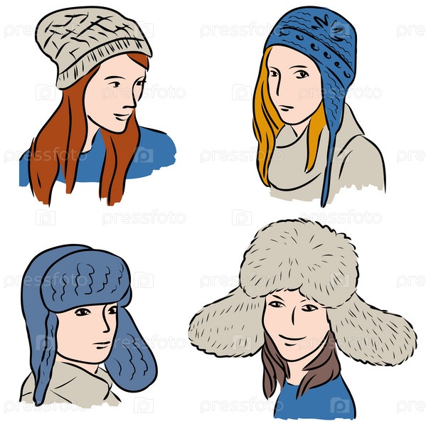 Векторная иллюстрация женских голов в различных шляпах на холодную погоду