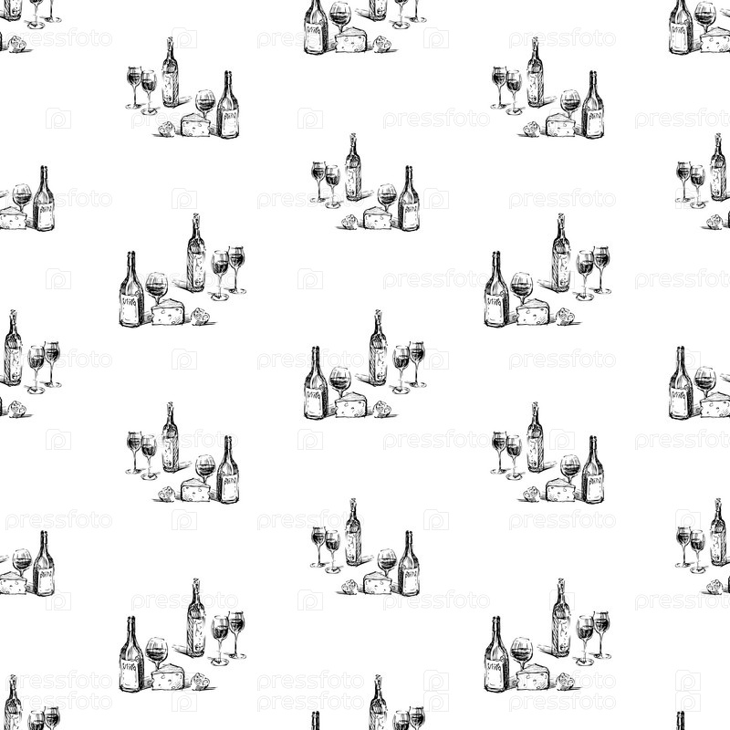 Бесшовный рисунок эскизов винных бутылок, стаканов, сыра и лимона
