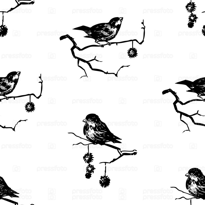 Бесшовные фоновые эскизы воробьев, сидящих на ветвях деревьев в зимний день