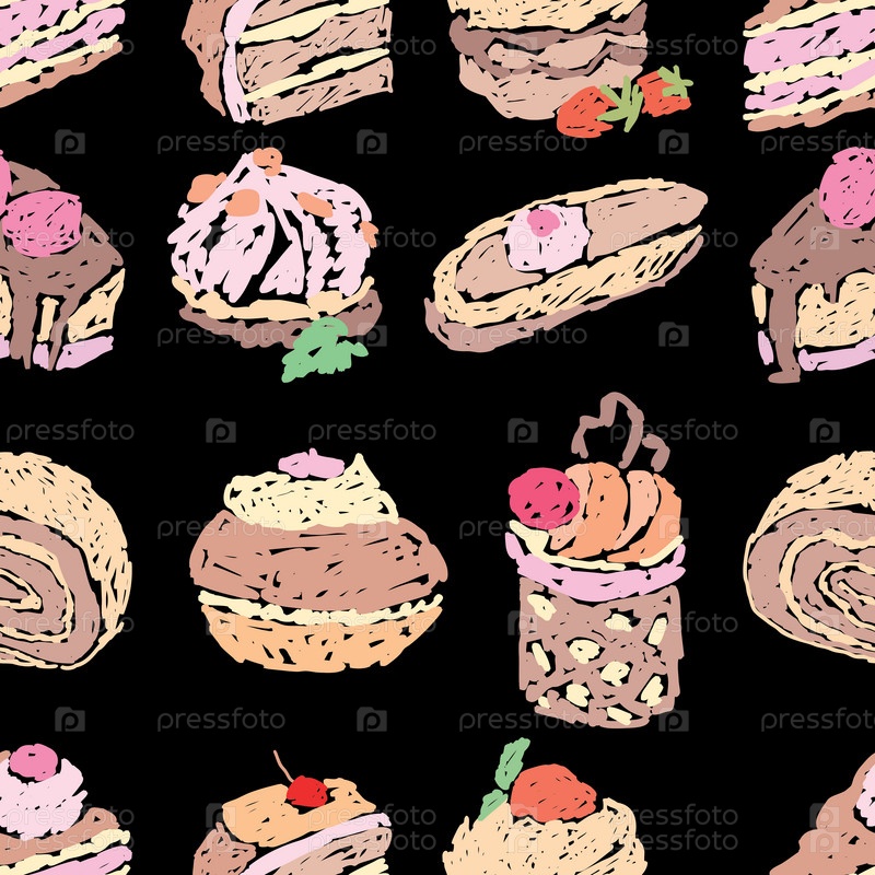 Бесшовный фон из различных нарисованных тортов