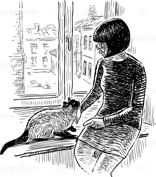 Эскиз женщины и ее тайской кошки, сидящих у окна дома
