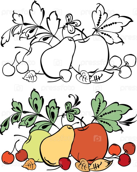 Векторное изображение декоративных фруктов и листьев