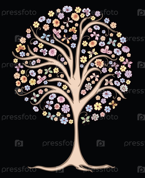 Векторное изображение цветущего дерева с цветами и бабочками