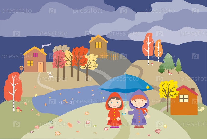 Векторное изображение веселых детей под зонтиком, прогуливающихся по деревне в осенний дождливый день