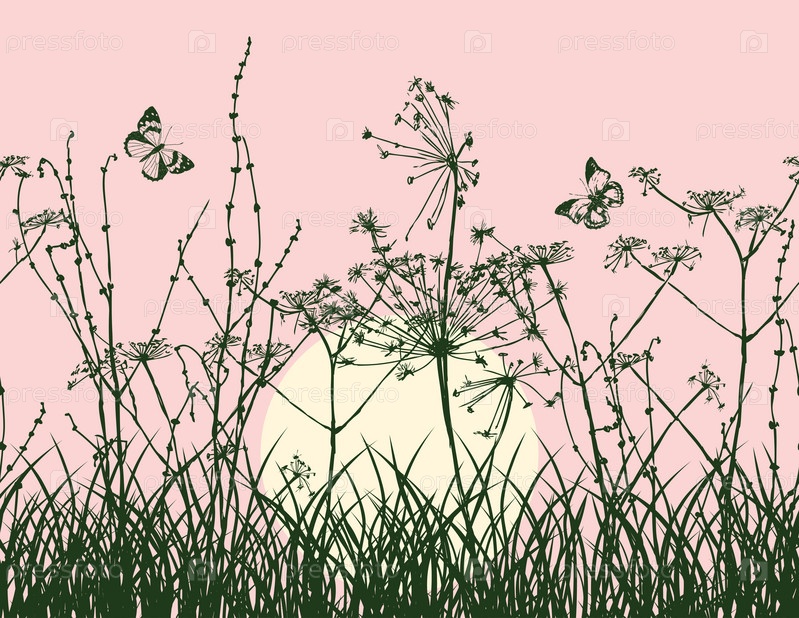 Векторное изображение силуэтов луговых растений на фоне восхода солнца