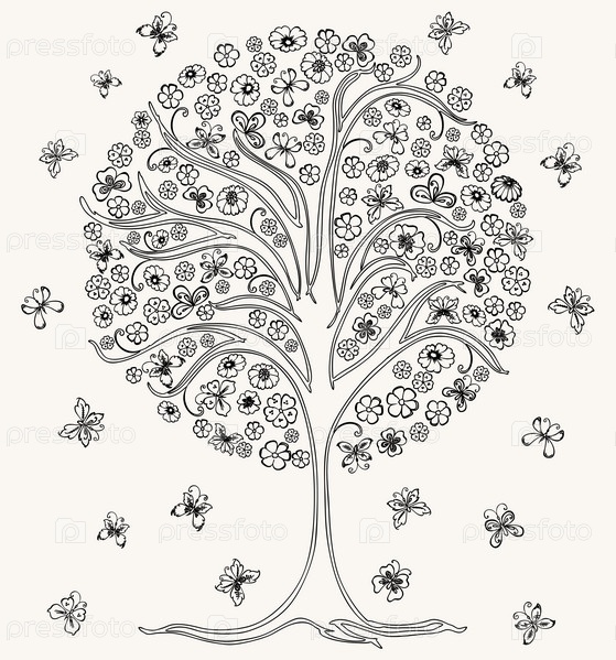 Векторное изображение очертаний цветущего дерева с бабочками