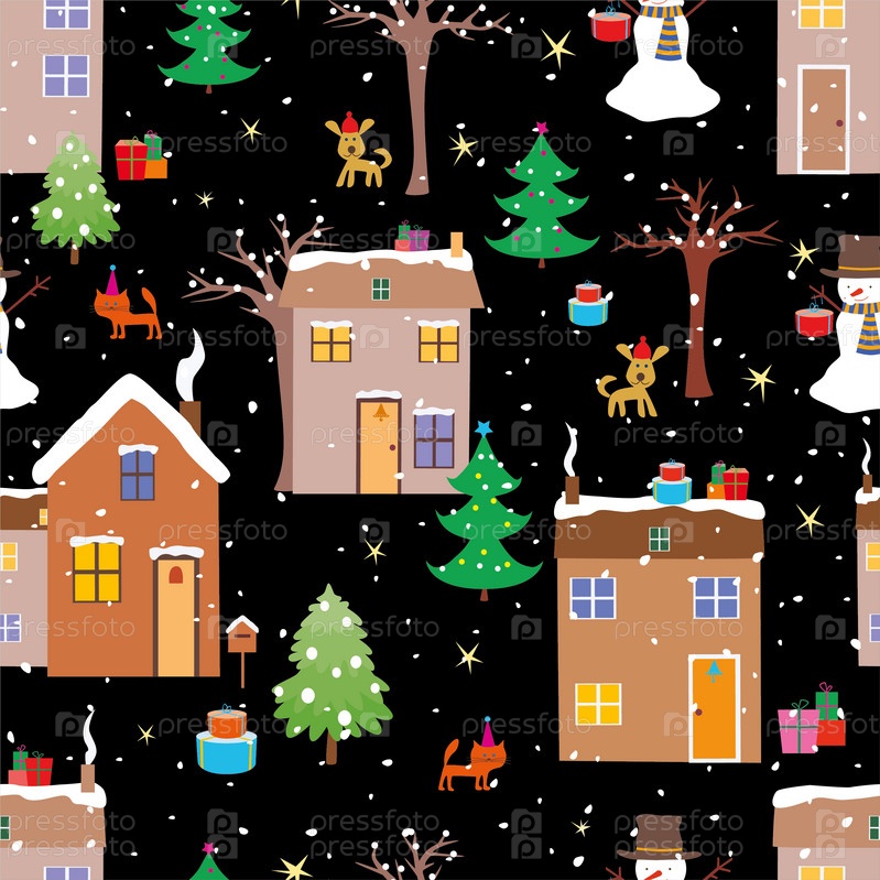 Бесшовный рисунок мультяшных домов на Рождество
