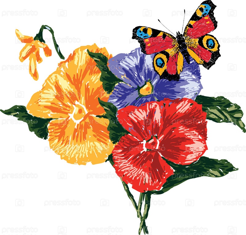 Векторное изображение анютиных глазок и бабочки. Все объекты изолированы