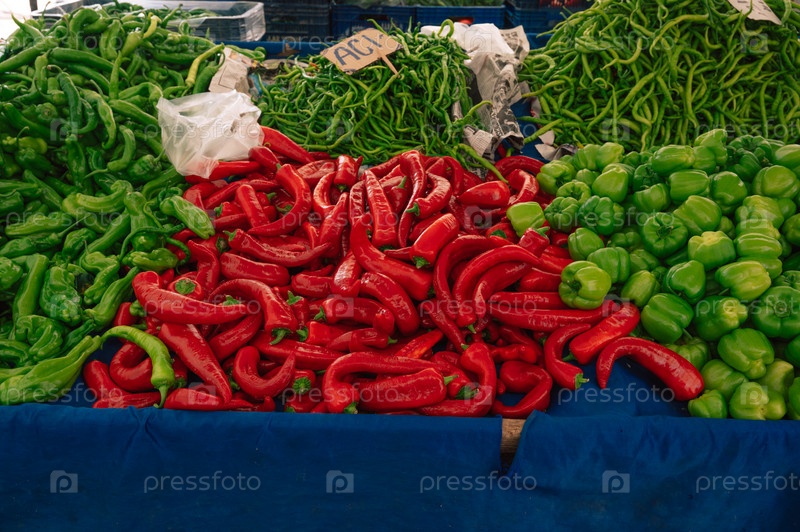 Продажа перца на традиционном фермерском турецком рынке, прилавок со свежими фруктами