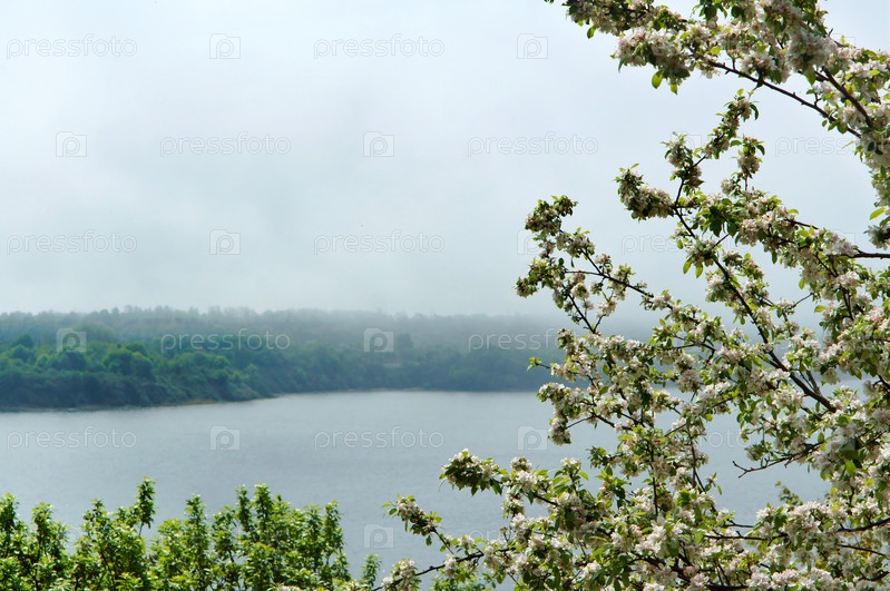 Цветущие деревья в тумане, туман и цветущие яблони над озером