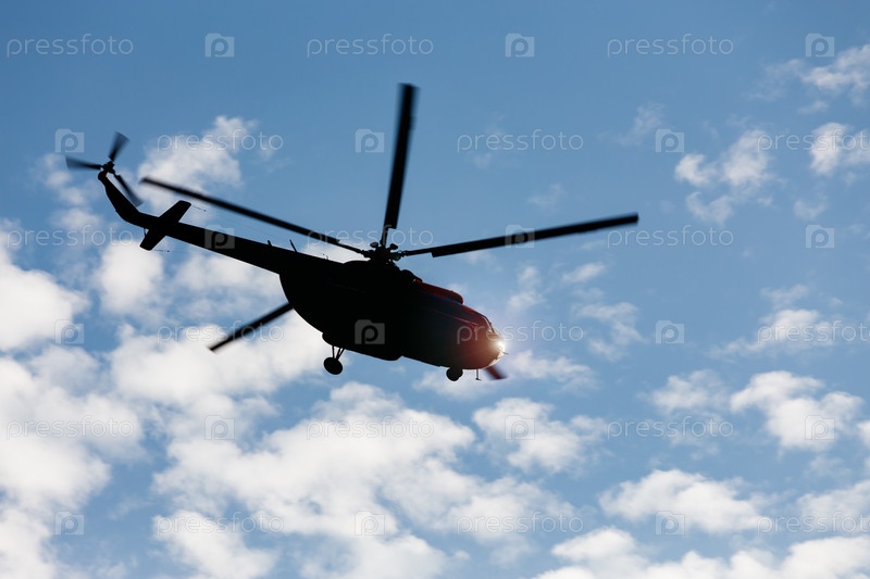Силуэт вертолета Ми-8 на фоне голубого неба с облаками в полете